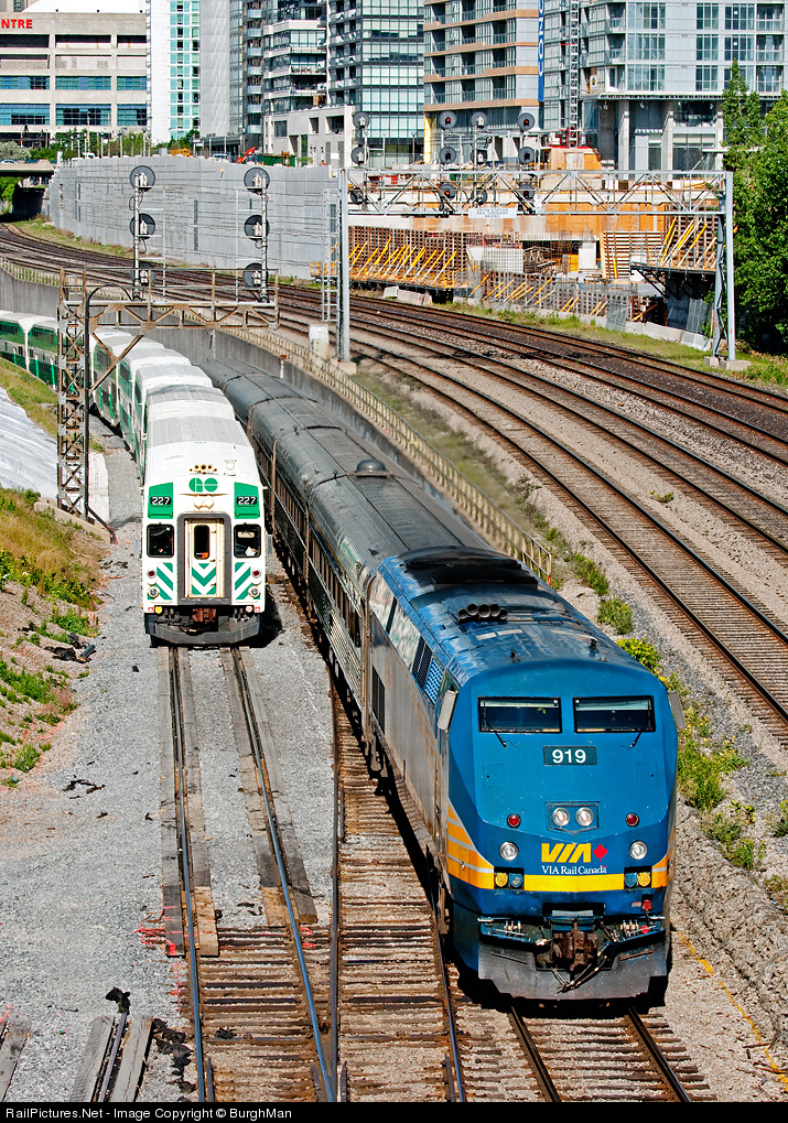VIA 919 and GO 227 race west from Toronto's Union Station.