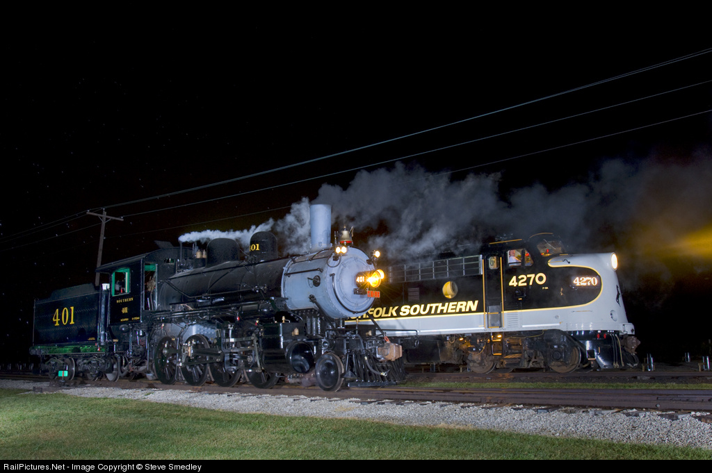 After a fifteen year restoration by the volunteers of the Monticello Railway Museum, Southern 401, a Baldwin Locomotive Works H4 2-8-0 built in November of 1907, debuted on Saturday and Sunday during the Railroad Days event. The 401 is shown with two of the NS executive F units during the night photo session conducted by Chris Guss, Don Kalkman and Steve Smedley on the museum grounds, with droplets of rain visible in the strobe lighting provided by ''Hand of God Lighting Productions''.