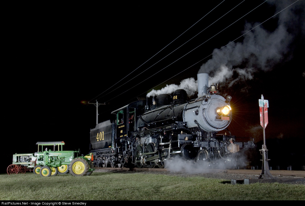 After a fifteen year restoration by the volunteers of the Monticello Railway Museum, Southern 401, a Baldwin Locomotive Works H4 2-8-0 built in November of 1907, debuted on Saturday and Sunday during the Railroad Days event. The 401 is shown posed with antique tractors during a night session conducted by Chris Guss, Don Kalkman and Steve Smedley on the museum grounds.STEVE SMEDLEY PHOTO