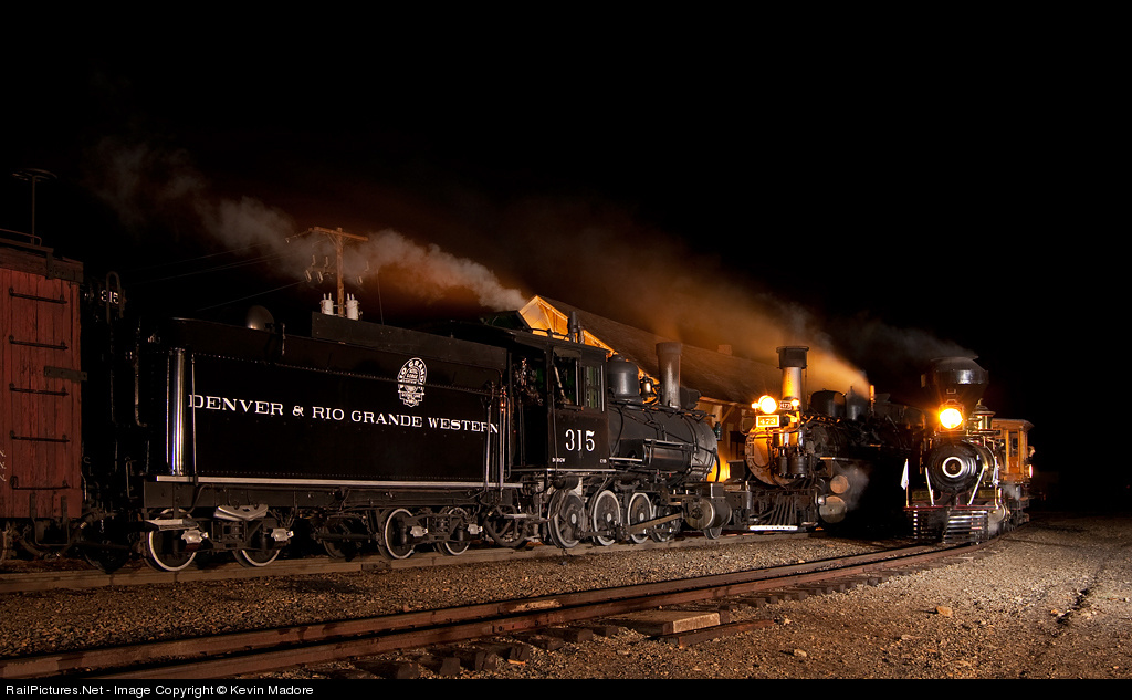 Three generations of narrow gauge, steam locomotives share the tracks in front of the Silverton Station on a cool August evening. On the main line, a Denver & Rio Grande Western C-18, built in 1895, stares down a company K-28, built nearly 20 years later. On the siding, a very ornate Eureka & Palisade American, built in 1875, looks more than a little out of place in Rio Grande territory. Although the service lives of all three of these locomotives did in fact overlap each other to a fair degree, their geographic differences would have prevented them from ever meeting "face to face". For that reason, this photograph does not pretend to depict a recreation of a historical event, but rather, it provides a first-hand record of one.