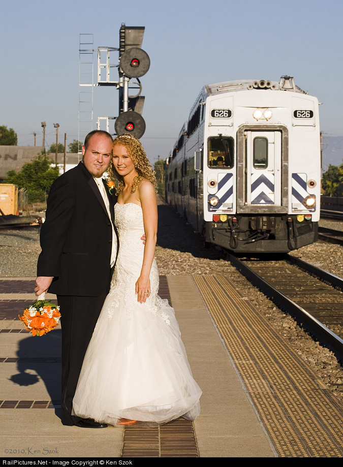 | One can see all kinds of things around Fullerton station. One common sight is a wedding photographer having a photo shoot with a couple for their engagement pictures; however, this was the first time I saw a wedding photographer showup with what appears to be a newly wed couple who posed for an image as a Metrolink train pulls into the station on track 1. I'm sure the engineer had a bit of a laugh seeing the wedding photographer and several rail photographers lined up getting their shots of the couple. |