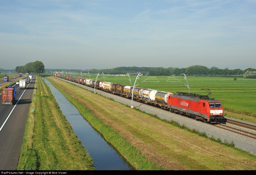 | An intermodal train coming from the Rotterdam harbour at the Betuweroute on his way to Germany and possible further to Italy. To the left the A15 motorway. Almost the whole line of 160 km follows this motorway. |