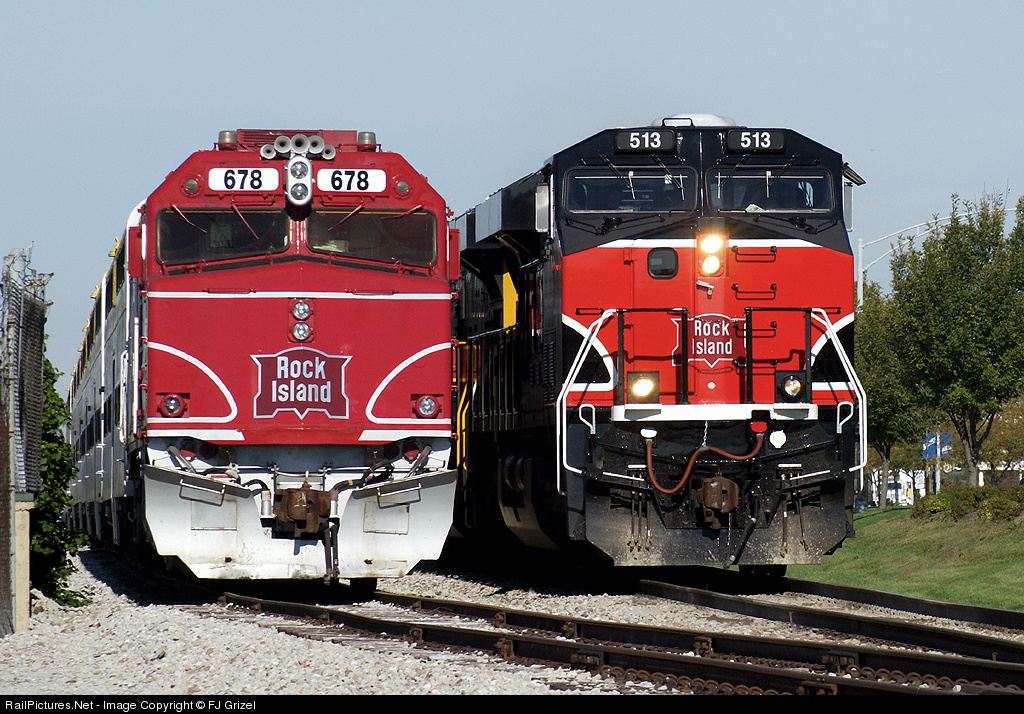 The morning September sun illuminates the noses of two generations of Rock Island heritage locomotives. On the left, IANR's F40 powering the Hawkeye Express, on the right, Iowa Interstate's GEVO 513 on the Cedar Rapids turn.