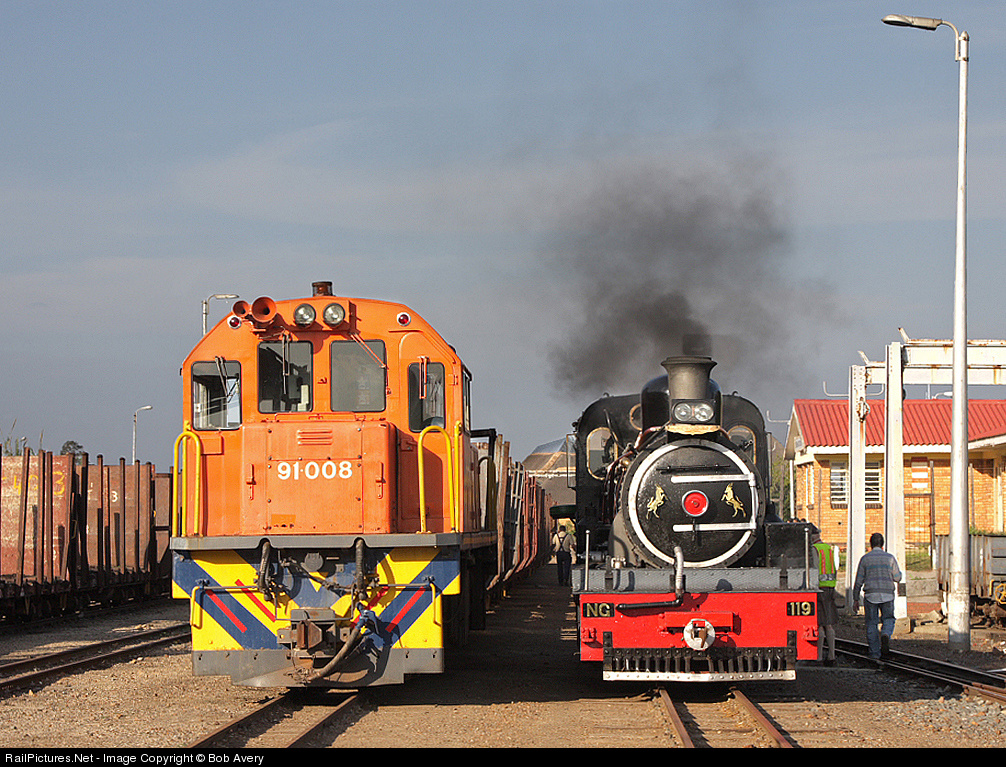 NG119 on Geoff Cooke's charter train poses alongside one of Transnet's GE-built 2-foot gauge diesels which had just arrived with some timber empties.