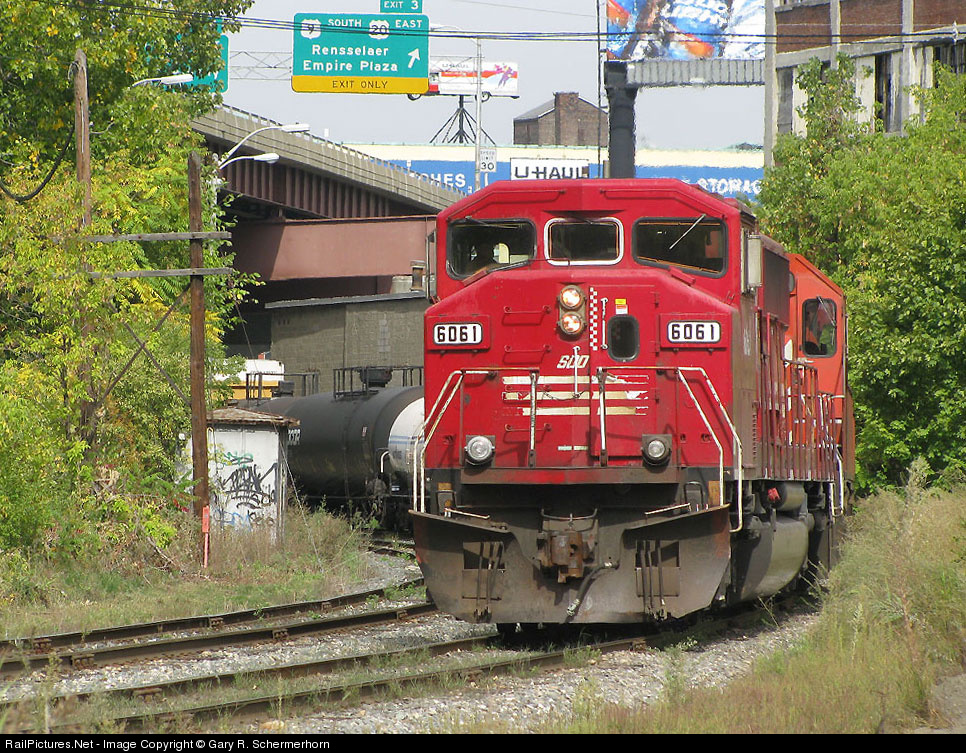 | A rare visitor to the Capital Region most days is this weathered former SOO SD60M '6061', one of the last in the series to be built by EMD. The crew are ready to unhook their train at Green Street and run the power into Kenwood Yard after arriving from Saratoga. |