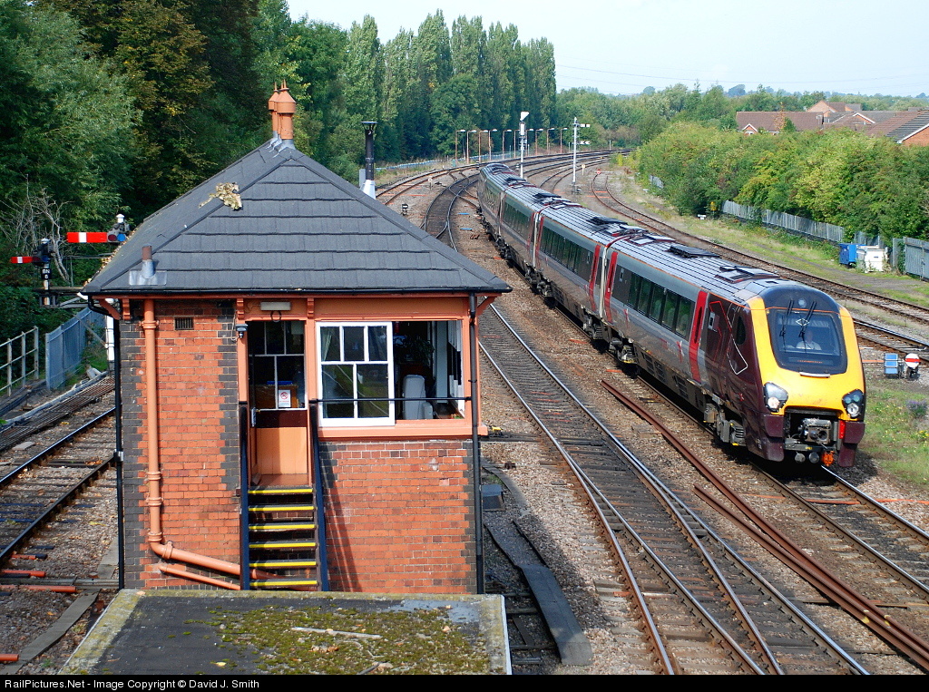 | A "Super Voyager", with a Manchester to Bournemouth service,passes the signalbox at Banbury North as it slows for the Banbury station stop. |