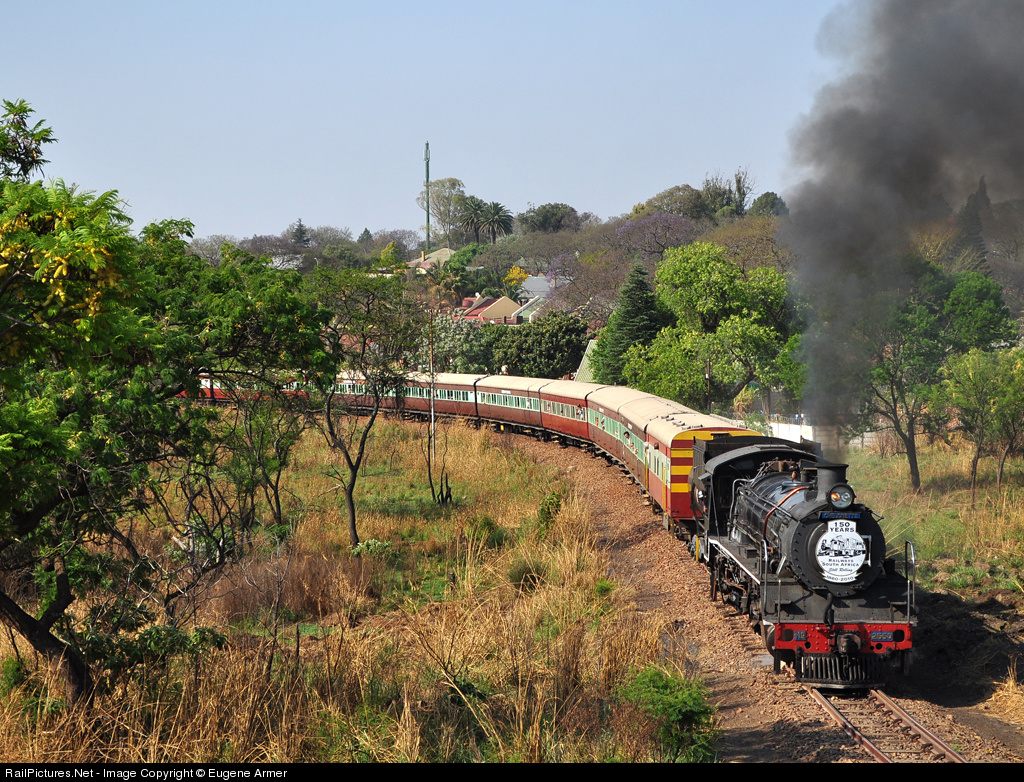 This year is the 150th anniversary of railways in South Africa and, to celebrate this historic occassion, Friends of the Rail operated a special passenger train from Pretoria to the mining town of Cullinan on the Heritage Day long weekend. The train is seen leaving Cullinan on the return leg to Pretoria. The locomotive is carrying a comemerative "150 years" headboard.