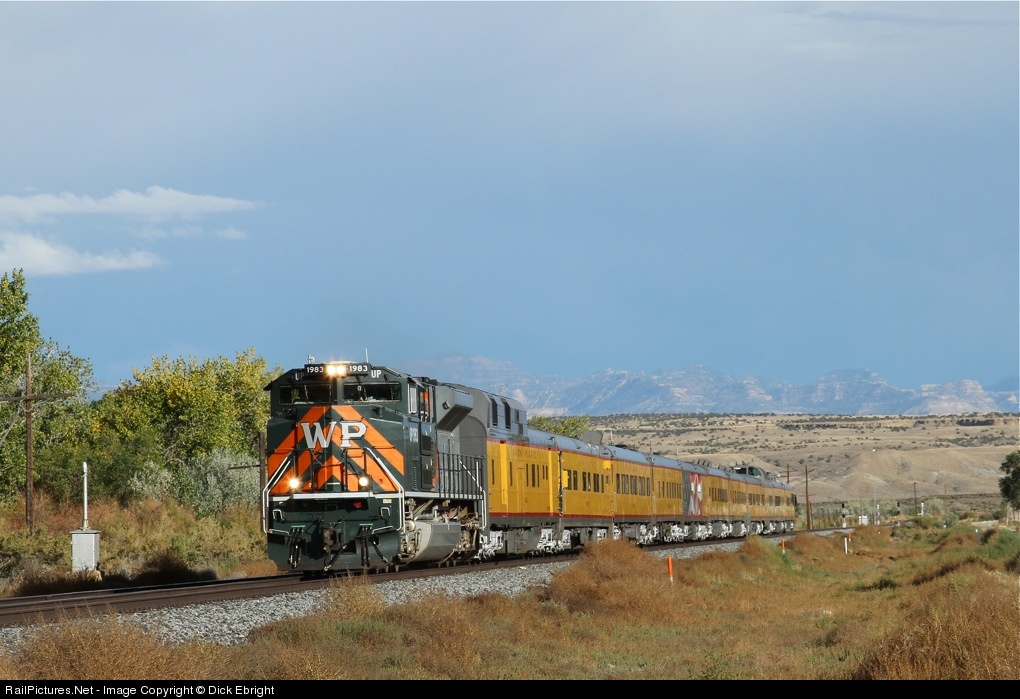 UP 1983, the Western Pacific Heritage Unit, brings this Engineering Special flying through the small Utah town of Wellington. The weather in eastern Utah was dark and stormy this day, but this "sucker hole" of sunlight allowed me to make this shot. The train stopped briefly in Helper for a crew change and then continued on to Salt Lake City.