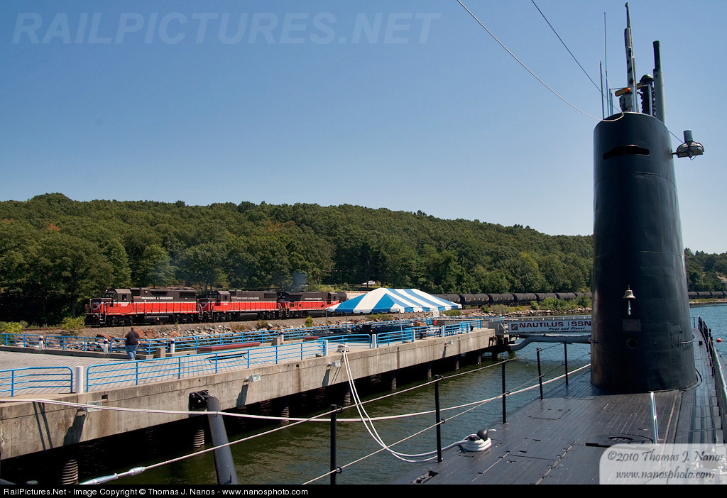 | Providence & Worcester loaded ethanol train K666 rolls north along the Thames River in Groton, CT and past the USS Nautilus at the US Navy Sub Force Museum. Canon EOS 40D, Sigma 18-50mm f/2.8 EX DC |