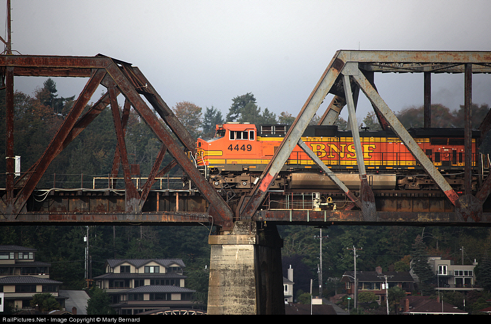 Scenic Subdivision Bridge 4 at mile post 6 (measured from King Street Station) is a Bascule Bridge (aka, a drawbridge) over the Lake Washington Ship Canal which divides Seattle from its first north suburb Ballard. The lead axle is on the fixed portion of the bridge and the remainder on the lift portion. This is the lead unit on a very long southbound (RR west) grain train made up of 3 lead units, around 100 covered hoppers, three mid-train DPUs, another maybe 100 covered hopper and two trailing DPUs. I speculate the train came over Stevens Pass (through Cascade Tunnel) in this configuration and it was made up east of the pass (Wenatchee?) from two trains.