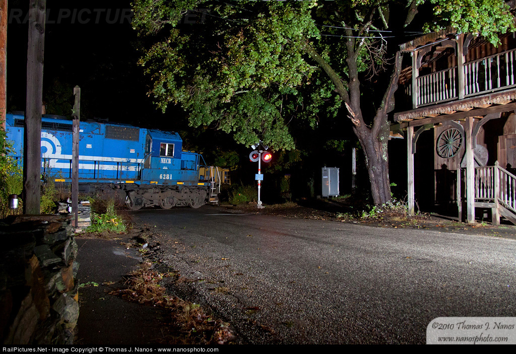 New England Central empty ethanol extra heads north through the Merrow section of Mansfield, CT at a little after midnight. Canon EOS 50D, Sigma 18-50mm f/2.8 EX DC, single Lumedyne flash