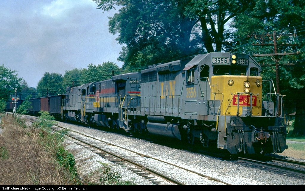 | Louisville & Nashville SD40-2 #3556, along with a C30-7/U30C pair of GE's, hustle Kentucky coal southbound towards Atlanta. #3556 later became CSX #8184. CSX selected the unit for its SD40-3 rebuild program and it became CSX #4025 |