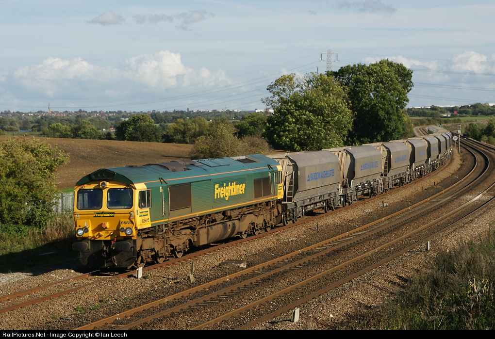 Freightliner 66615 approaches Wellingborough on the Thorney Mill to Bardon Hill empty Bardon Aggregates train.