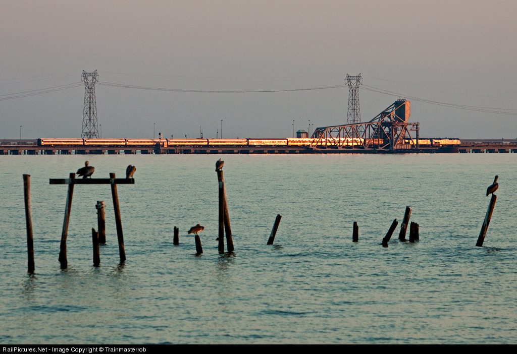 | Bound for New Orleans, the westbound Crescent Limited pounds the drawbridge on the world famous NS Lake Pontchartrain Bridge as Pelicans pay no mind to the passing train. |