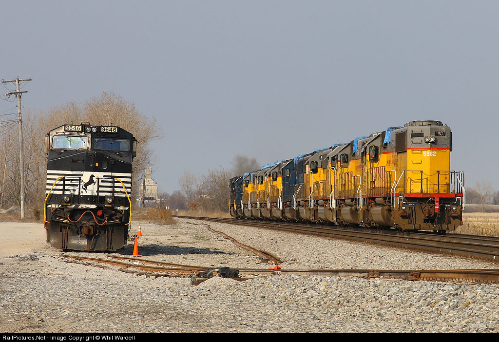 | Sitting bad ordered at National Lime & Stone, NS 9646 watches as NS train 992 takes 10 HLCX SD60's toward Bellevue to be reactivated for service. The former PRR coal dock at Harvey is in the background. |