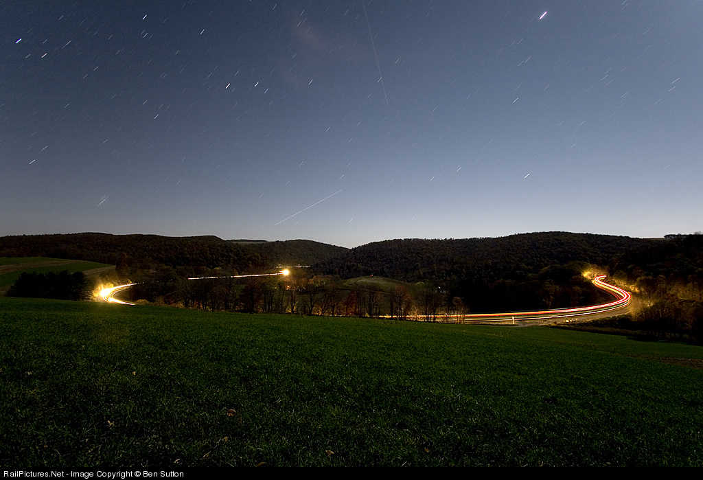 | A bright moon lights up Mance and the fields surrounding the photographer, and the stars streak through the clear night sky while planes fly overhead streaking to their destinations as the Westbound Capitol Limited P029 streaks around the famous Mance Horseshoe Curve. The entire curve can be seen from beginning to end and across the hillside near the signal "NA". |