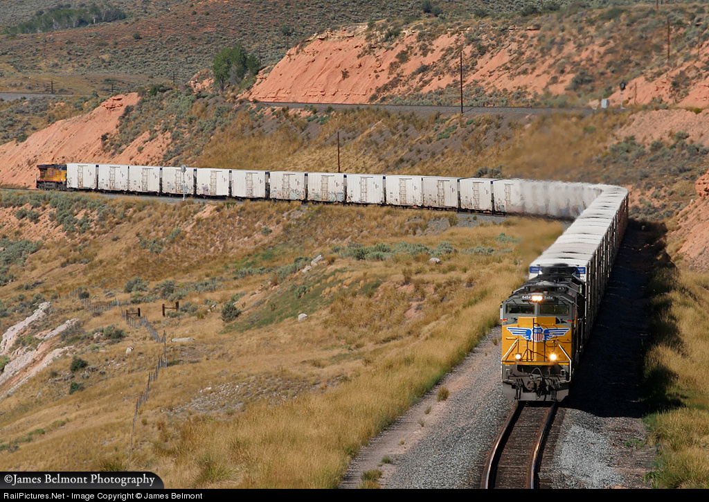 A contemporary version of the old Southern Pacific-Union Pacific-Conrail 'Salad Bowl Express' heads east up Echo Canyon approaching the 6824 ft. summit at Wahsatch, Utah. This train of Central Valley produce originated at Delfar (Delano-McFarland), California (approx. 28 miles north of Bakersfield) and will terminate as a unit train at the CSX rail yard at Selkirk, New York.