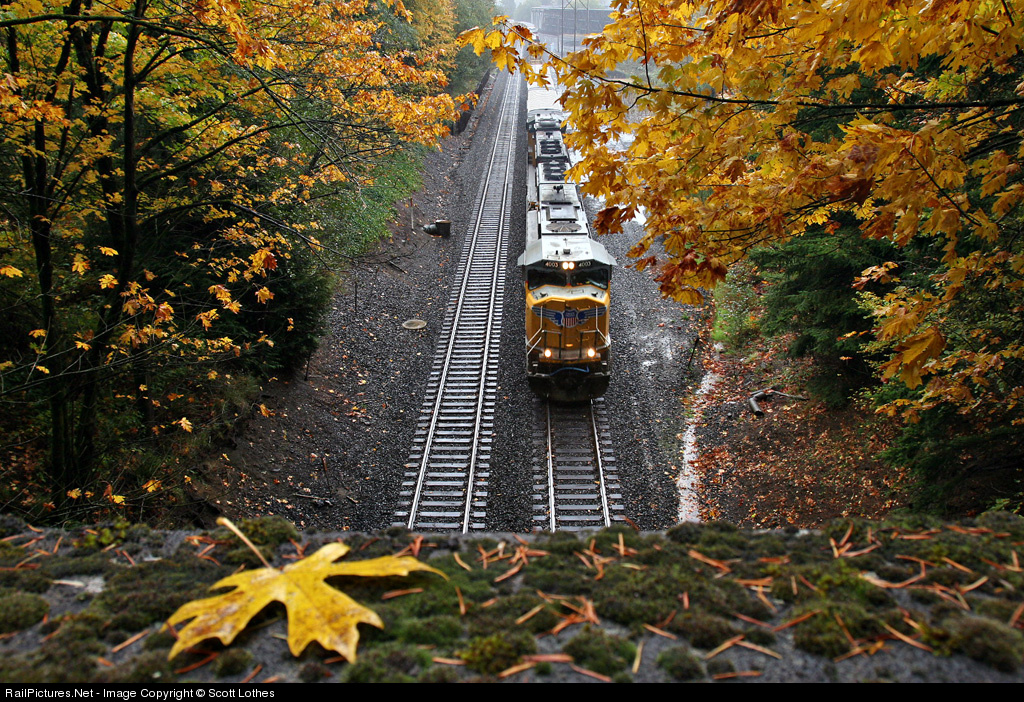 Union Pacific northbound freight train about to enter the Ostrander Tunnel just north of Kelso, Washington, shrouded by bigleaf maple trees at peak fall color. The photo was made while heading home from the annual Autumn Leaf Slideshow in Centralia, Washington, where Robert Scott, Steve Eshom, and company once again put on a memorable event. Unlike my autumn leaf photo after last year's slideshow, where the leaves had fallen naturally, I admit to a little set-dressing in this one.