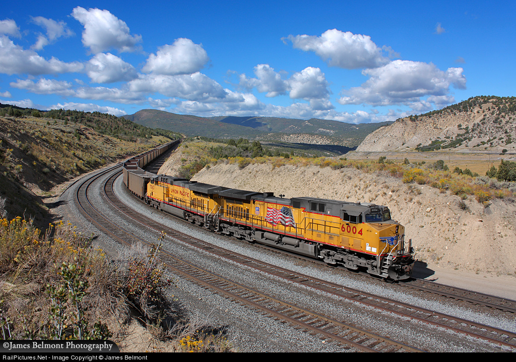 Union Pacific's Valmy, NV to Skyline, UT coal empty squeals around the lower horseshoe curve on former D&RGW rails at Gilluly, Utah. UP 6004 and 7063 are distributed power units shoving on this 91 car unit train bound for the Pleasant Valley Subdivision via Colton Jct. 16 miles further east by rail.