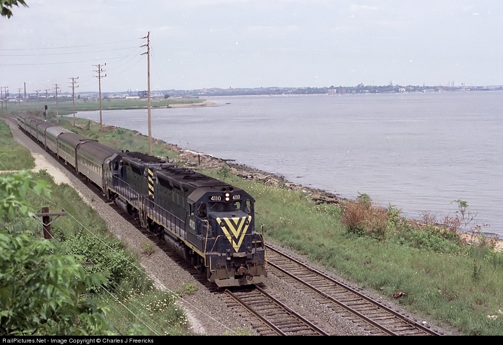 A Conrail passenger train runs south of South Amboy along side the Raritan Bay, on its way to Bay Head. This image was shot from the Route 35 through truss overpass. The two GP40Ps are pulling a string of used fluted side passenger cars from a number of other railroads. By this time, all of this equipment belonged to New Jersey DOT, but the trains were being run by Conrail. If memory serves me right, we had set up here hoping for some Es, but were surprised by the GEEPs.
