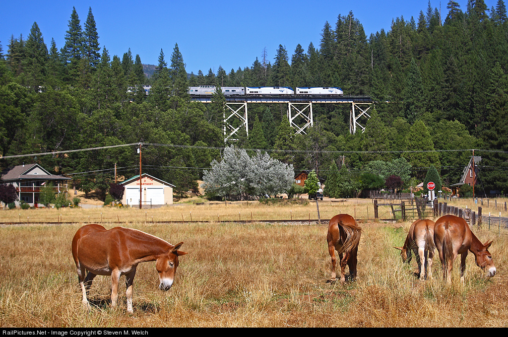 | A$$'s get back to grazing after bugging the photographer for pretzels, and are oblivious to the Feather River Express heading to Portola, soaring high above the Chandler Creek. |