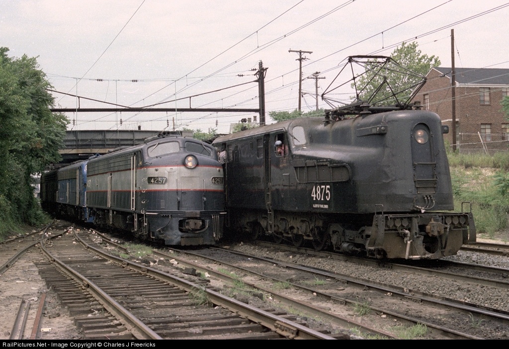 If ever there was a great spot for train watching it was South Amboy and its engine change. The NJDOT GG1 that brought train #3359 from New York City moves out of the way as a neat lashup of an NJDOT E8, the only Conrail blue E8 and a patched Penn Central E8 prepare to back to the train in order to pull it down to Bayhead. The track coming towards me is the Raritan River connection.