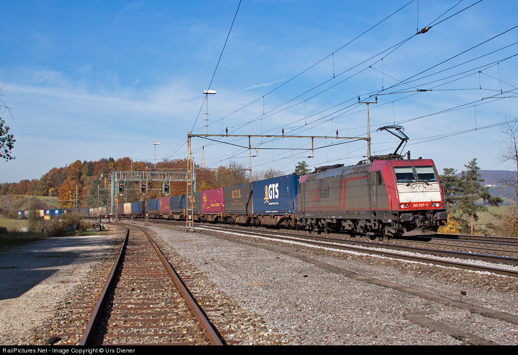 | The Crossrail BR 185 597, leased from Beacon Rail Leasing Ltd, with the GTS container train on the way to Italy. |