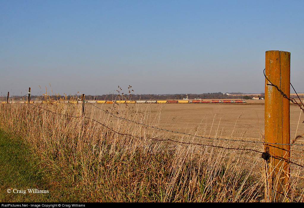 | Iowa Northern's North Crew heads south with 75 cars of grain bound for ADM in Cedar Rapids, IA. This crew just picked up the 75 cars of grain off the DM&E at Nora Springs. The crew had a slug set and 3 other units to pull this 10,000 tons, which wouldn't be enough power to pull out of Rockford as the crew would stall in about 5 miles. |