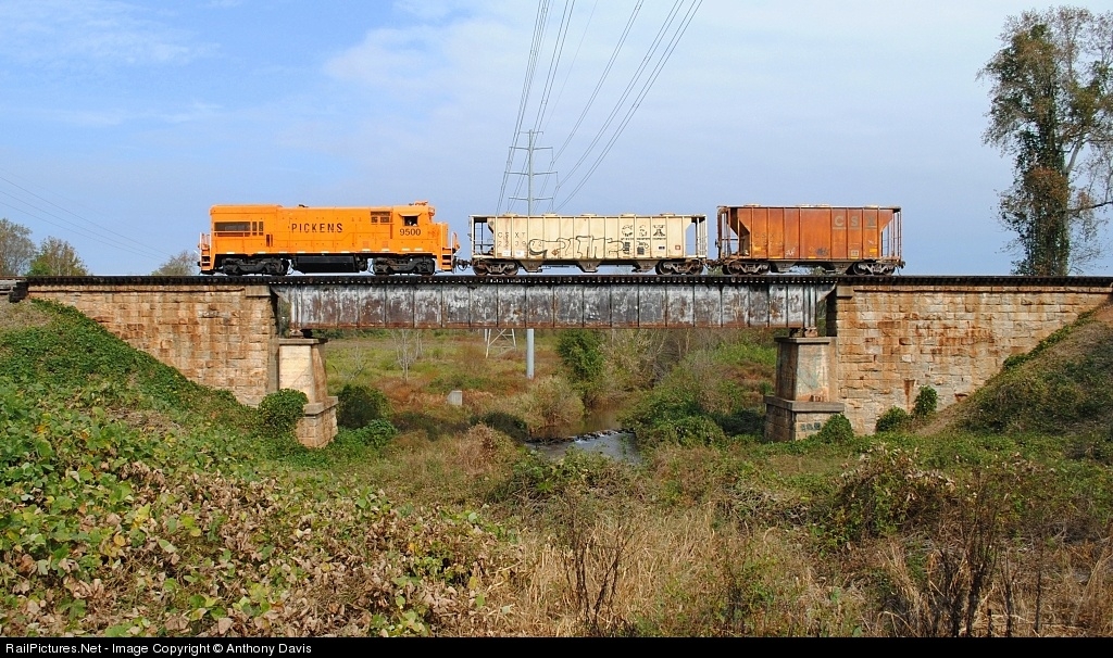 | A Rocky Bridge over Rocky Creek! In a very unusal move, the Anderson Job crew ran from Gluck to Belton to pick up the two hoppers, seen in this shot, to take back to the Owens Corning Plant in Gluck. This was the only work for the day since NS P67 failed to run to the Interchange in Downtown Anderson the previous night. PICK 9500 is seen here crossing over Rocky Creek on its return trip back to Gluck. I've been wanting to get this shot for the longest and got extremely lucky on this move since they ran while the light was right for this shot! |
