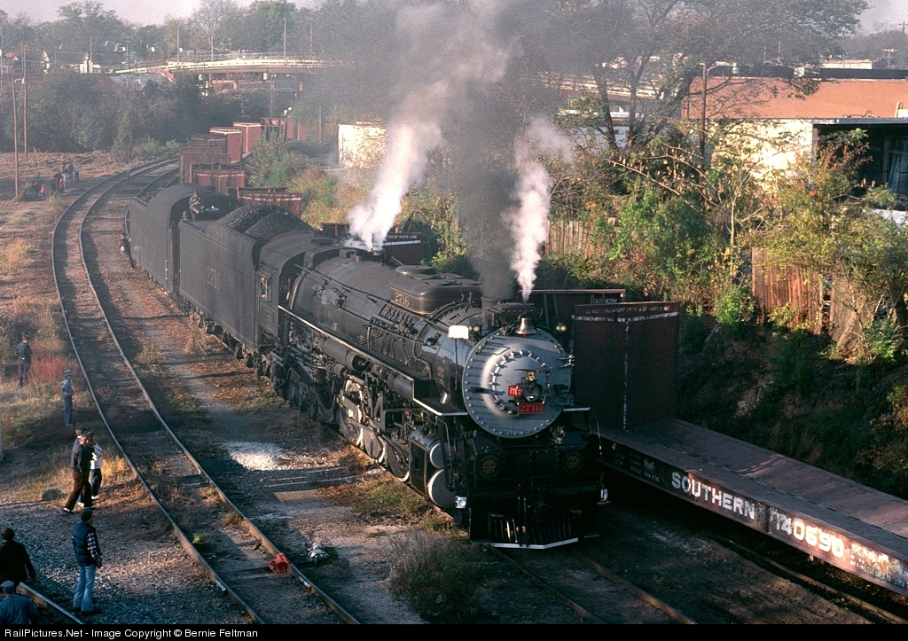 Southern Railway "Kanawha type" 2-8-4 #2716 has been watered, coaled, inspected and lubricated and is backing around the wye to gather its train and return to Birmingham. During this momentary lull, the crew can take care of their personal needs. The fireman, sitting on top of the coal tender, has just opened a box lunch and is eating a late dinner