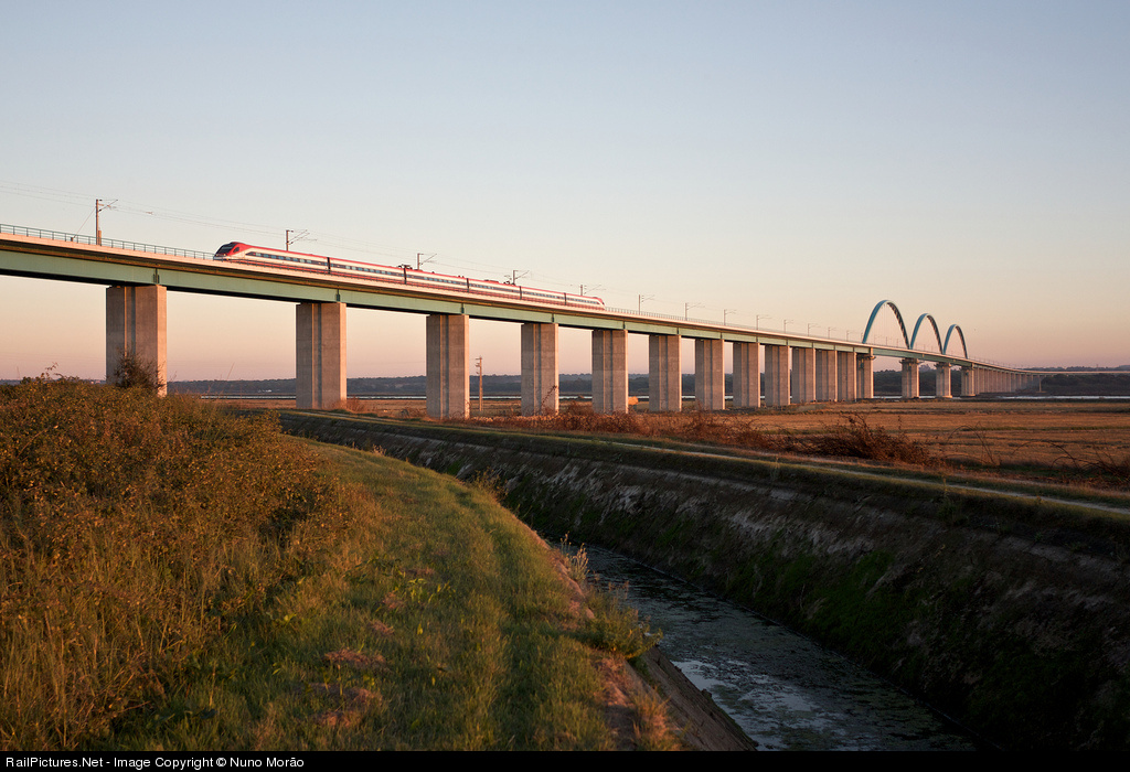 CP 4000 series Pendolino train with an Alfa Pendular service to Oporto, seen in the recently opened Alcácer Deviation, which features a very nice-looking bowstring-arch bridge.