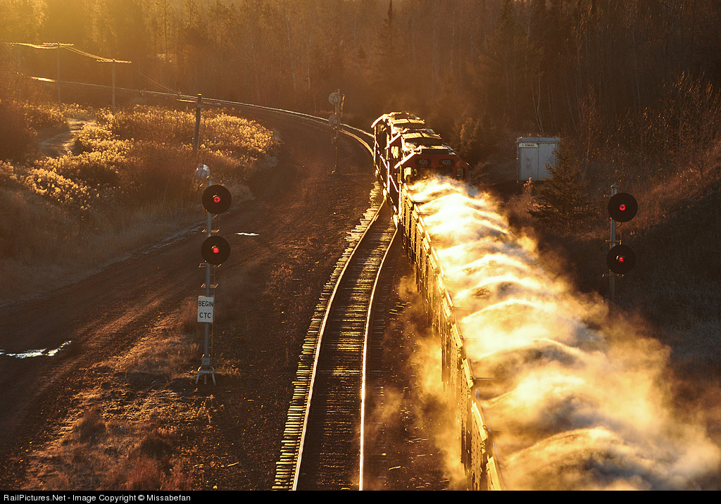 | Go towards the light! With frost on the ties and vegitation and fog in the air, a matched trio of SD40-3's head east into the sun, which has just cracked the horizon on a crisp fall morning. The steaming taconite pellets are doing a good job of obscuring the 120 ore cars that are hauling them. |