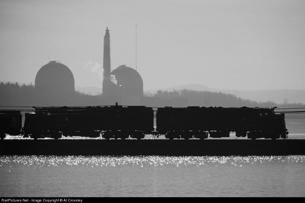 Back when it was Metro North Commuter Railroad, a pair of its FL9s, 2010 and 2013, lead train 860 north on the causeway just north of the Peekskill station a few minutes before 1 pm. The backlit, midday colors in the original slide were so muted as to suggest conversion to monochrome.