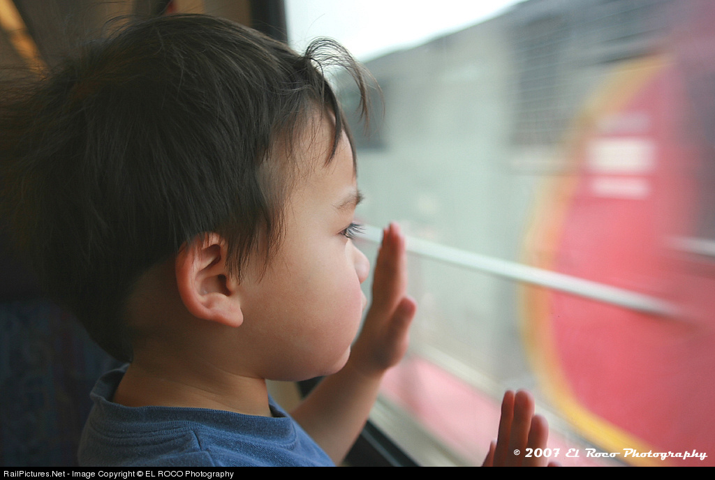 | Visions of the Warbonnet - A person's interest in trains sometimes starts at a young age. Here a young railfan stares transfixed out the window of Metrolink Train 600 en route to San Bernardino while it passes a stack train in the hole at C.P. Prado in the Santa Ana River Canyon. |
