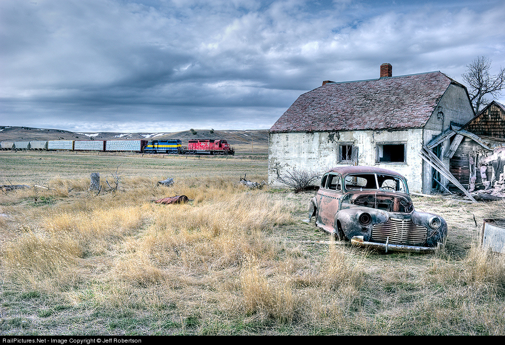 Time marches on, at a very slow 10 MPH, as STL+H 5593 leads train 470, the Rapid City to Huron train, passed an abandoned farm house near Wasta, SD. The CPR influence has started creeping into the far reaches of the DME.