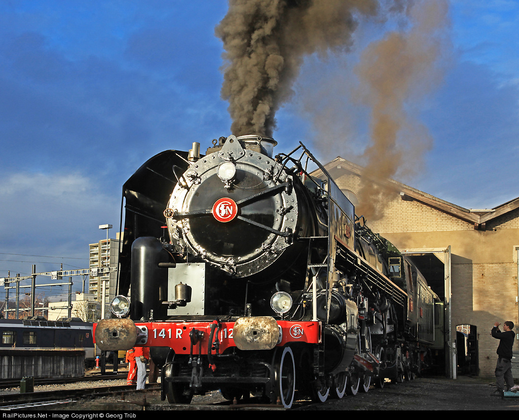 After more then 12 years or about 4400 days the ex French Railways SNCF steamlocomotive 141 R 1244 was put under steam pressure for the first time again on november 9th 2010. The 2-8-2 "Mikado" was built by Montreal Locomotive Works in 1946 and came to Switzerland to association "Mikado 1244" in 1976. Since the last run on september 5th 1998 there was much work done: Boiler and chassis revision, renewal of the cabin, new second steam generator placed, removing the boiler insulation (asbestos) and re-isolation, all boiler cover sheets replaced, complete repainting, rebuilding brake from Westinghouse to Oerlikon system, revision and renewal of tender including trucks with new paint, new tires on all 20 wheels, extension Integra Signum train protection system and installation ETM-S and much minor things. In the next time the locomotive will make test and acceptance runs to be ready for 2011.