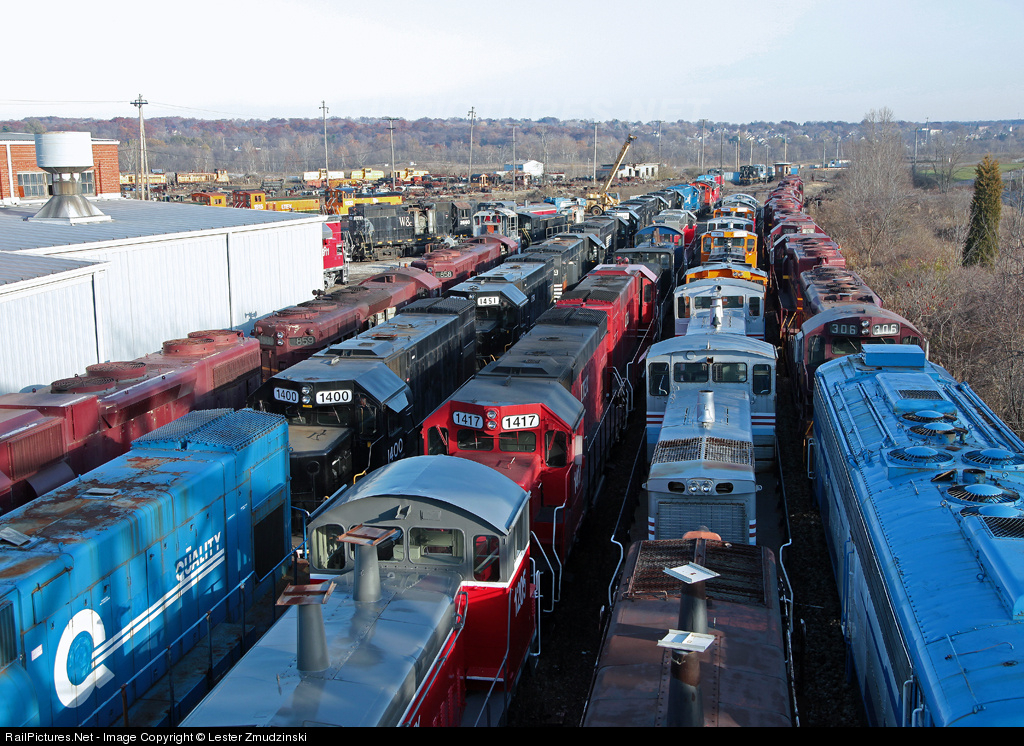 | A lot has been moved around since my last visit. Most of the inner tracks at "Larry's Alley" are refurbished locomotives Geep 15s seem to be in vogue this year. I see that more ex Missabe have joined the line. In addition to the eight on the right, five maroon and gold are stored far left. Former BLE 858, nee DMIR (top left) was running. Perhaps she'll be on the inner tracks in the near future. |