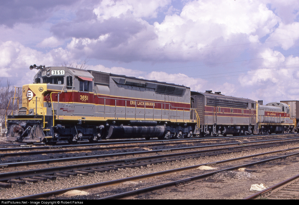 EL 3651, 7132, and 1039 wait at the west end of the EL Kent yard. Here's one of EL's famous locomotive mixes with an EMD SDP-45, EMD F7-B, and ALCO RS-3 all on the same train.