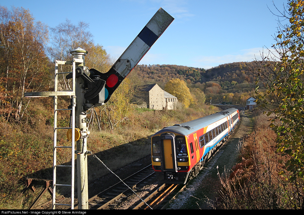The rich golden Autumn colours outshine even the bright East Midlands DMU livery at Grindleford in beautiful North Derbyshire. Semaphores still rule here, controlled by Grindleford Box, lending something of the character of yesteryear to this scene. Even more of yesteryear can be seen on the left where the gable end of the recently restored Padley Chapel, a 14th century gem, overlooks the line.