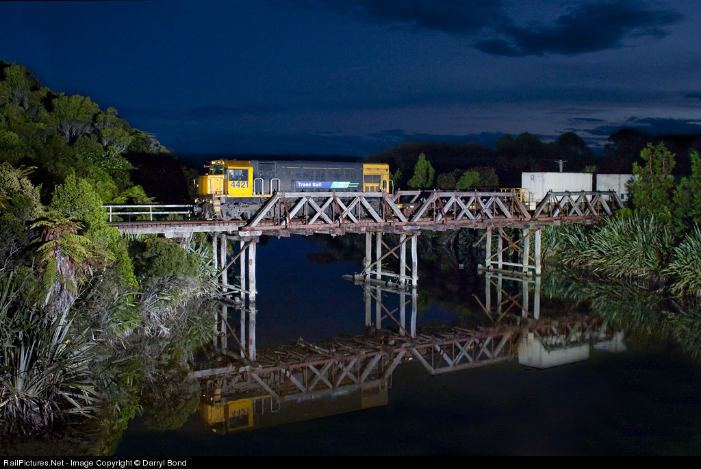 Trains on 3' 6" (1.067m) track from Whangarei to Bluff with virtually heritage rebuilt EMD and GE locomotives still the mainstay power. The network was privatized in 1990's and operated by Toll until 2008 when state owned KiwiRail was established.