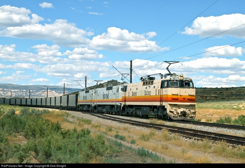 The Deseret Ry has but one siding, the aptly named Midway Siding, located about halfway between the Deserado Mine and the Bonanza Power Plant. Oddly enough, it is not electrified. In over 25 years of watching this railroad, I have only seen it used to store MOW equipment. In this shot, E60 #DPR-2 is leading DPR 3 & 4, two ex NdeM units, on a loaded coal train westward at Midway. This is a mid afternoon train and the shot was taken at 4:45 PM with the edge of a cloud partly obscuring the sun. This stretch of the railroad is oriented nearly north-south, almost the only such stretch of track on an otherwise east-west railroad.