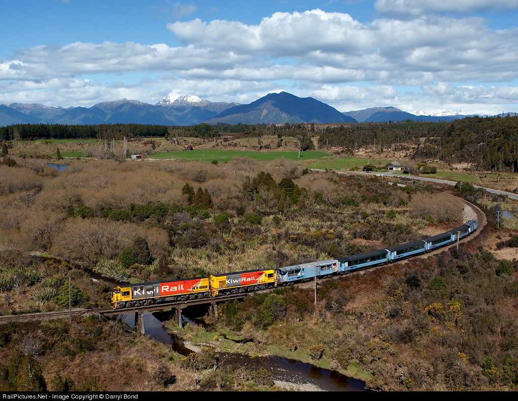 Trains on 3' 6" (1.067m) track from Whangarei to Bluff with virtually heritage rebuilt EMD and GE locomotives still the mainstay power. The network was privatized in 1990's and operated by Toll until 2008 when state owned KiwiRail was established.