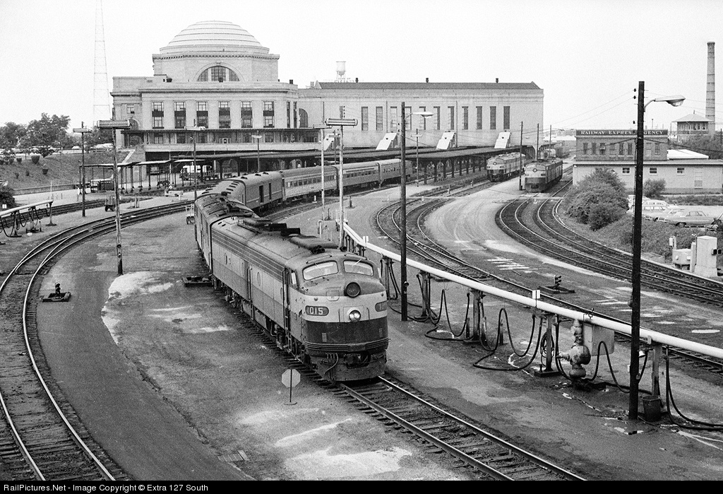 Northbound RF&P Train No. 86, the "Everglades," awaits its 4:15 PM departure from Broad Street Station in Richmond, VA in May, 1970. E8A No. 1015 has come through on SCL from Jacksonville, FL. Several RF&P E8As were equipped with Mars headlights and ATS in a pool power arrangement south of Richmond on the former ACL.