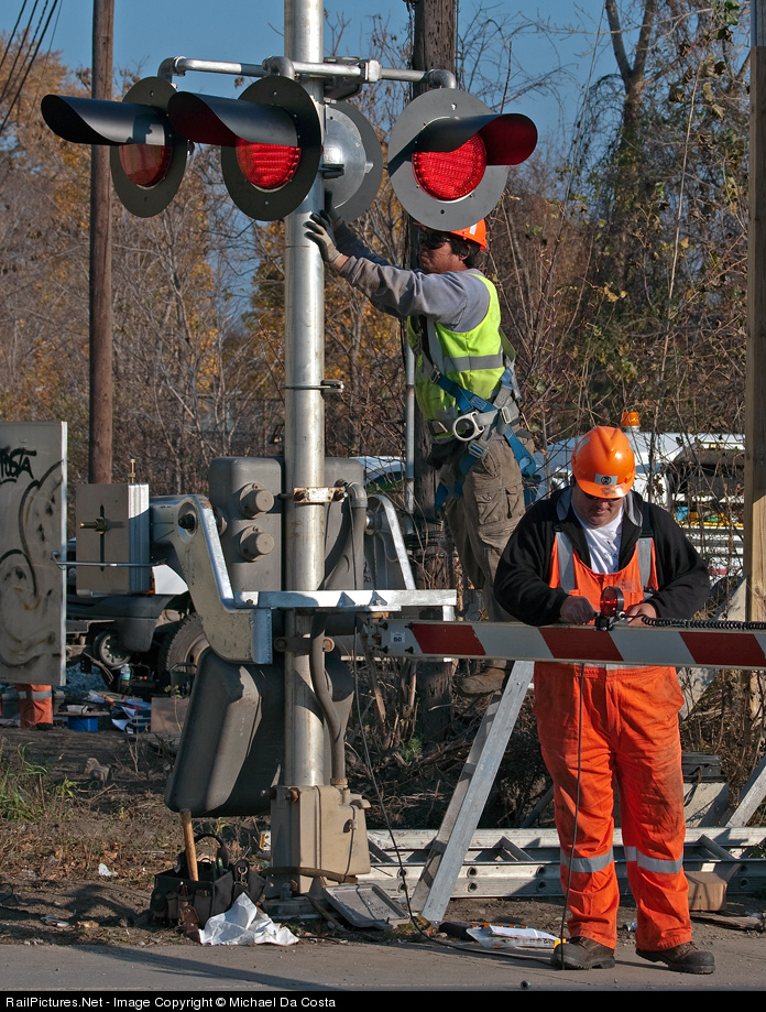 | A signal maintainer goes about his business finishing up the gate wiring for this newly installed crossing signal, meanwhile his apprentice mounts a bracket to the mast before mounting the sign to it depicting how many tracks this grade crossing has. |