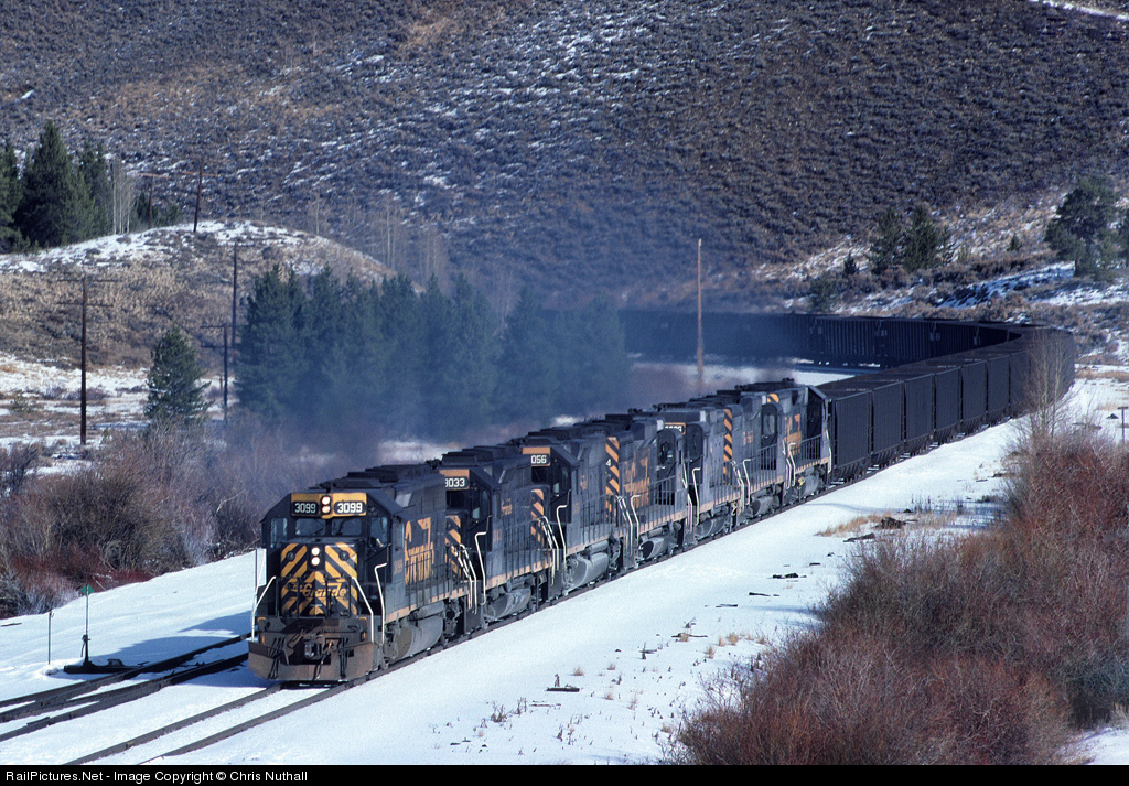 | A 100-car #790 eastbound coal heads through Pando behind 3099 3033 3056 3014 3026 3020 3111. Assisting from Minturn to Tennessee Pass were ten mid-train helpers with a further three just ahead of the caboose as far as Kobe, making a total of 55,950 hp. |