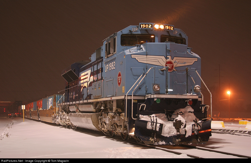 The Mopac heritage engine stops in Ogden for a crew change before continuing East to it's final destination of Global 4. This train has been in a snow storm for most of it's journey so far. A carman can be seen in the distance inspecting the train from his truck as a light snow falls.