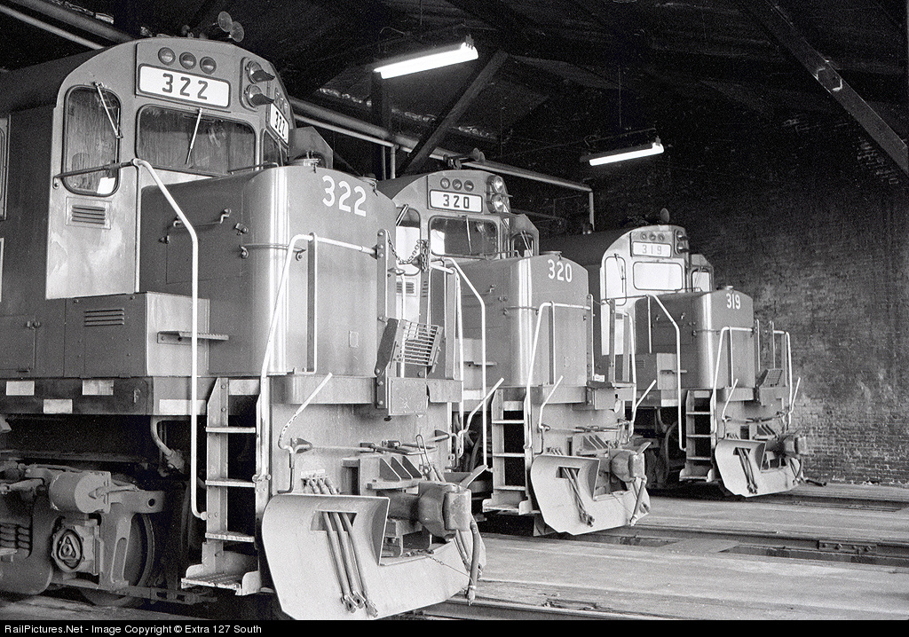 | GB&W Alco C424s No's. 322, 320 and 319 rest inside the roundhouse at Norwood Shops in Green Bay, WI on June 17, 1981. |