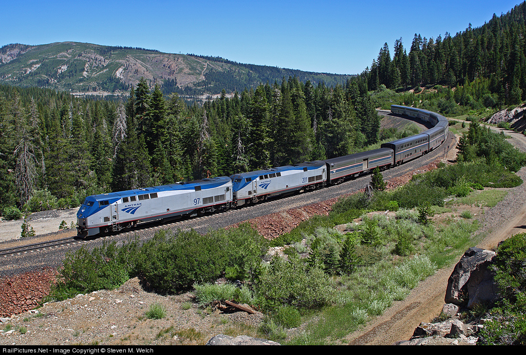 | AMTK 97 (YESHIR!) continues to claw its way up the East slope of the Sierra Nevadas and Donner Pass, only about a mile from the 7,000 foot summit. |
