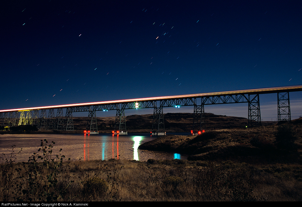 Dinner Theatre... A Hunter's Moon provides for subtle illumination of the scene as a southbound UP manifest traverses the Joso trestle of south-central Washington. Red and blue navigation lights provide ample warning for barge traffic along the Snake River. A pleasant scene while waiting for one's steak to cook. Scanned From Transparency: Fuji RDP III