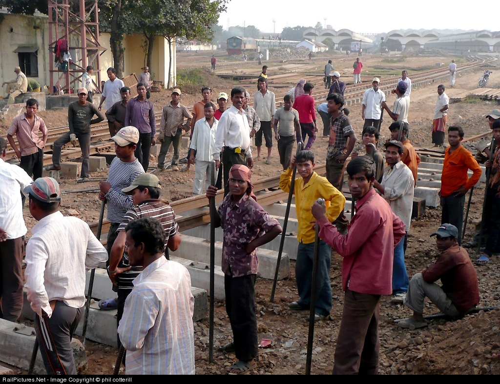 A track gang is at work at Kamlapur (Dhaka`s main station). They are installing dual gauge track to allow broad gauge trains from the west of the country to reach the capital.Note the footwear!